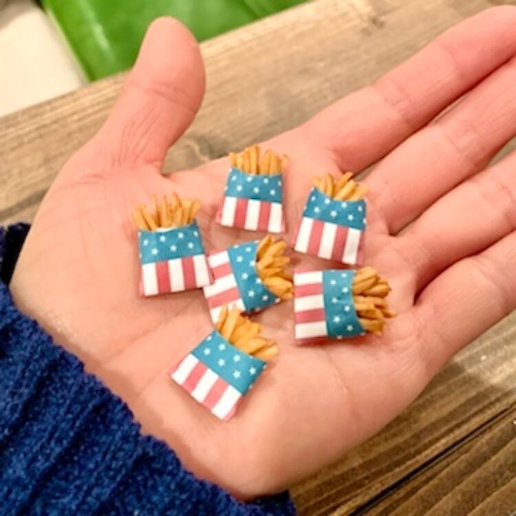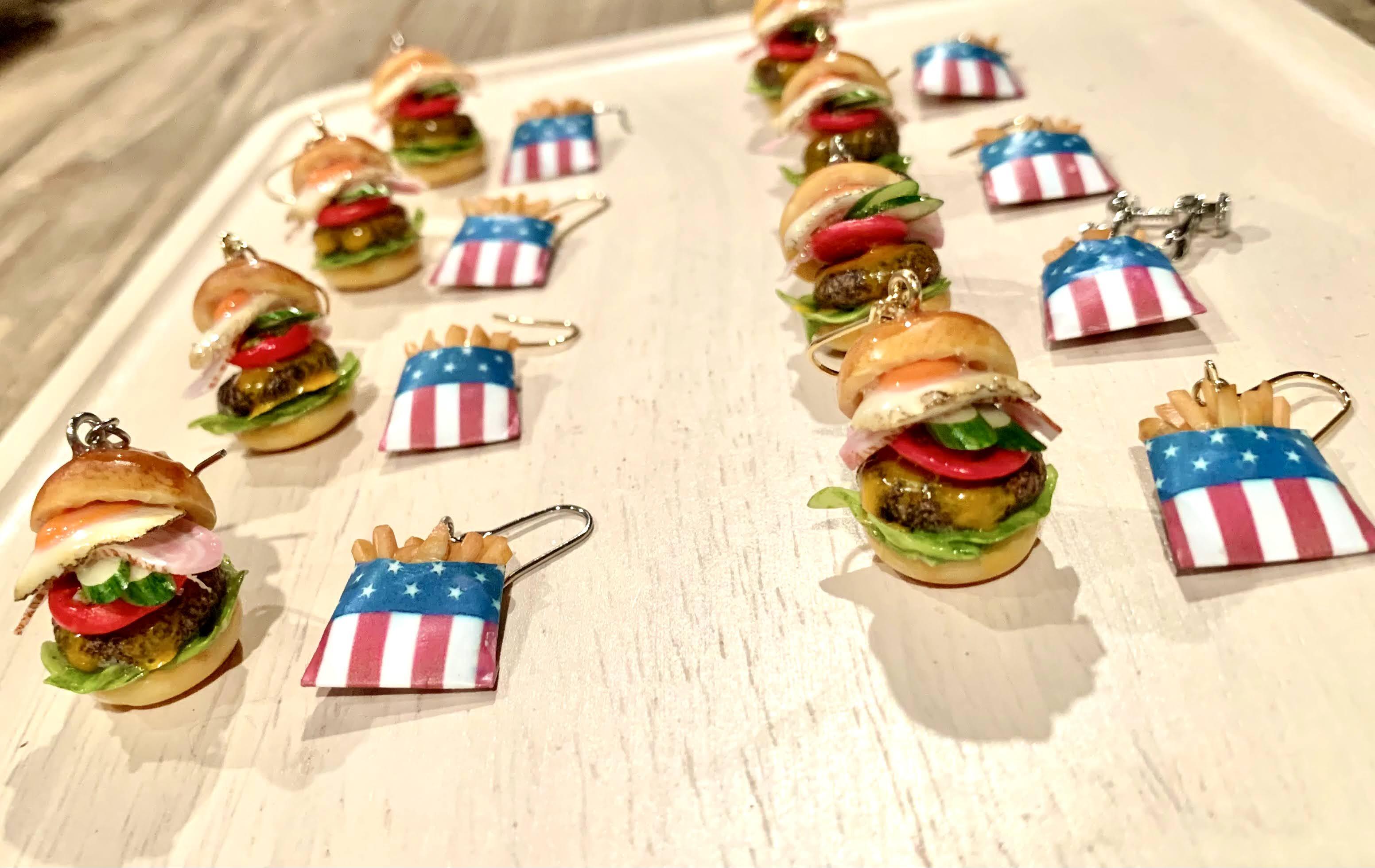 樹脂粘土で作成しましたミニチュアフード ハンバーガーとポテトセットのピアスです。