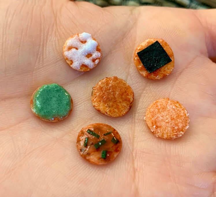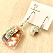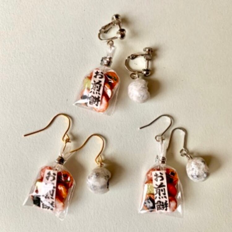 樹脂粘土で作成しましたミニチュアフードお煎餅と豆大福のピアスです。